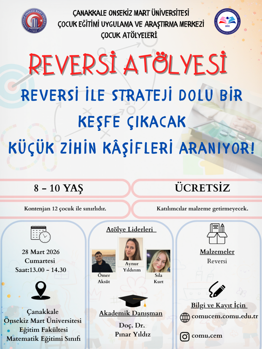 Çocuk Eğitimi Uygulama ve Araştırma Merkezi olarak, 8-10 yaş arası çocukların düşünme, planlama ve strateji geliştirme becerilerini desteklemek amacıyla Reversi Atölyesi’ni hayata geçiriyoruz. Bu atölyede çocukları strateji temelli bir zekâ oyunu aracılığıyla eğlenerek öğrenebilecekleri keyifli bir deneyim bekliyor.