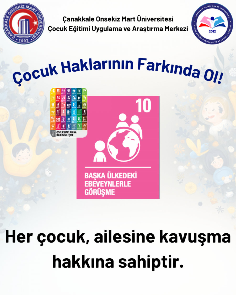 Birleşmiş Milletler Çocuk Haklarına Dair Sözleşme’nin 10. maddesi, çocukların ve ailelerinin ülkeden ayrılma veya ülkeye giriş taleplerinin insancıl, olumlu ve gecikmeksizin değerlendirilmesini güvence altına alır. Madde, çocuğun ailesinden ayrılmama hakkı (Madde 9) ile doğrudan bağlantılıdır ve özellikle farklı ülkelerde yaşayan aile üyelerinin bir araya gelmesini kolaylaştırmayı amaçlar.